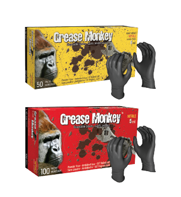 Get your hands in Grease Monkey powder-free, nitrile gloves. Choose 50-count boxes of heavy-duty 8 mil gloves with extended 11" rolled cuffs for extra wrist coverage and durability, or 100-count boxes of 5 mil gloves with 9.5" rolled cuffs for everyday use.