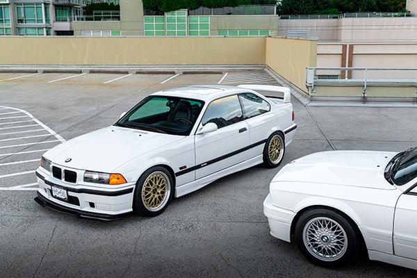 A respray from Black Cherry Auto Works was set in motion, painting it the mesmerizing white it is today. Tavish brought the vehicle back home so he could begin reassembling everything and installing new trim, gaskets, and suspension components with all original parts. But something was missing, the performance of the M3 left something to desire. Tavish installed KW coilovers and BBS LM wheels with a fresh set of rubber to improve the feel of the car. To make the vehicle his own Tavish committed to styling the car with GT and LTW parts such as the adjustable front splitter, wing, and motorsport seatbelts. Lastly, a full interior refresh was done with black leather including the door cards and a suede headliner.